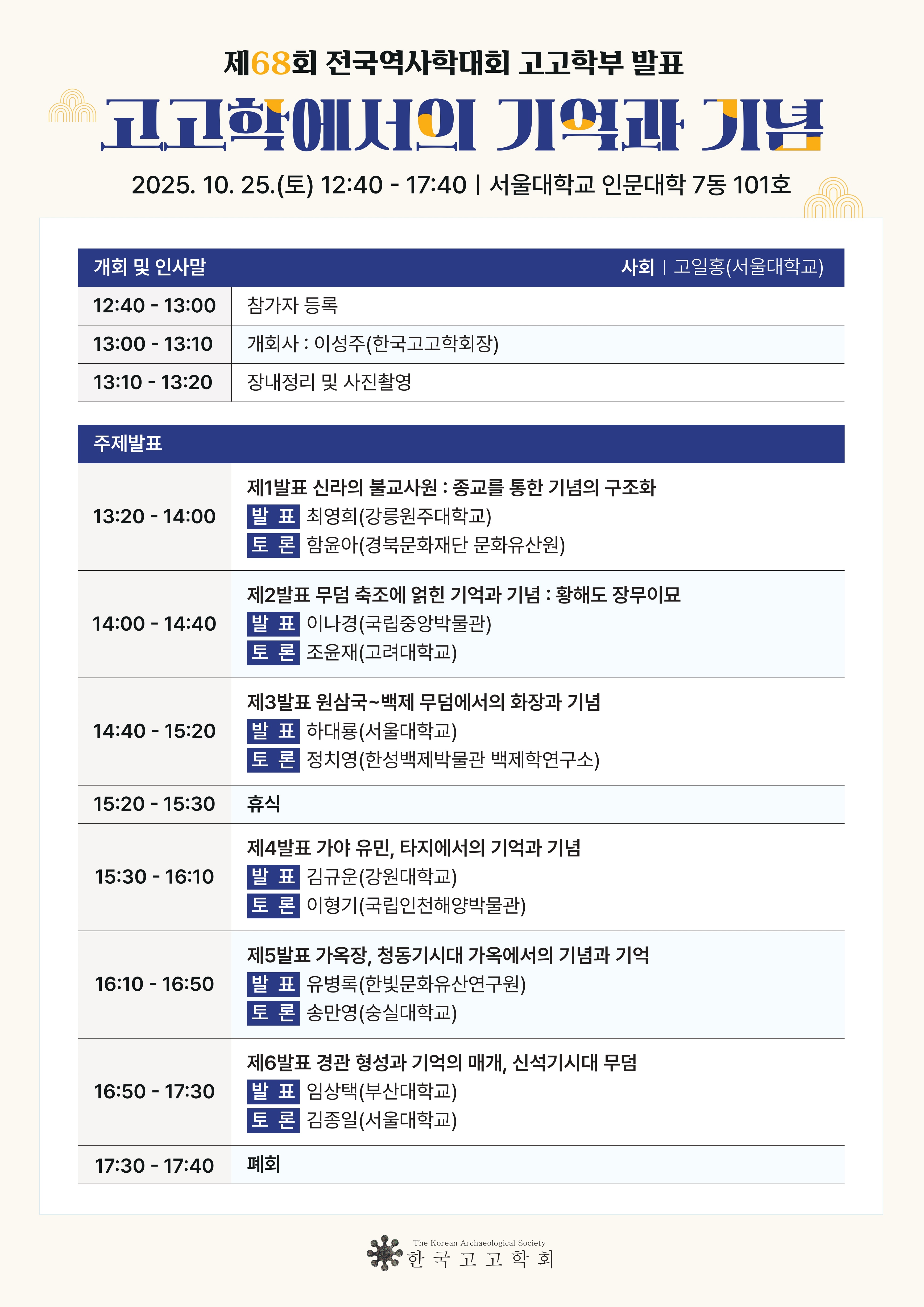 한국고고학회에서는 <고고학에서의 기억과 기념>이라는 주제로 고고학부 발표를 마련하였습니다.