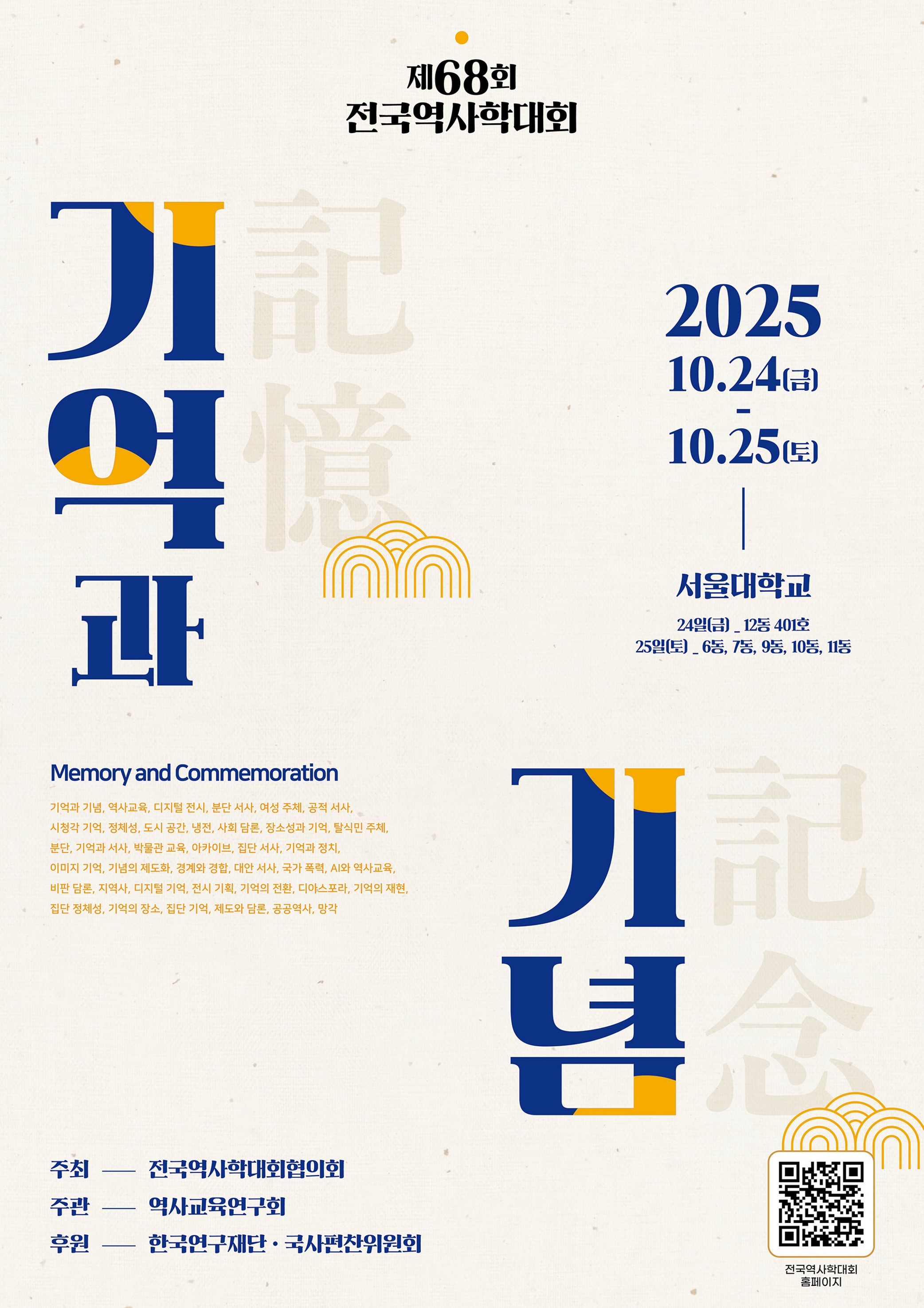 전국역사학대회협의회에서 주최하는 제68회 전국역사학대회가 10/24(금)~10/25(토) 양일간 서울대학교에서 개최됩니다.
