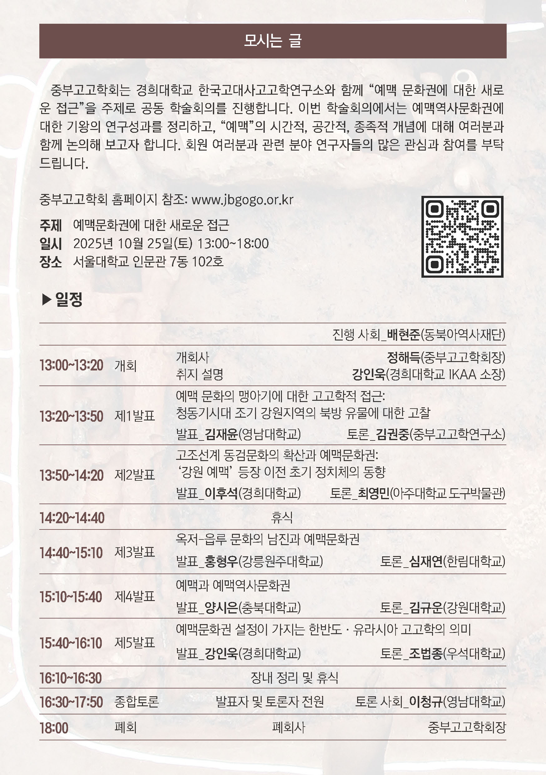 중부고고학회는 경희대학교 한국고대사고고학연구소와 함께 "예맥 문화권에 대한 새로운 접근"을 주제로 공동 학술회의를 진행합니다.