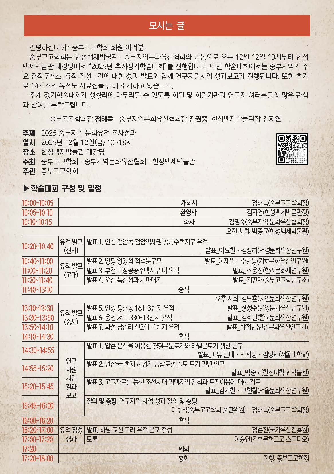 중부고고학회는 한성백제박물관·중부지역문산협회와 공동으로 오는 12월 12일 10시부터 한성백제박물관 대강당에서 “2025년 추계정기학술대회”를 진행합니다.